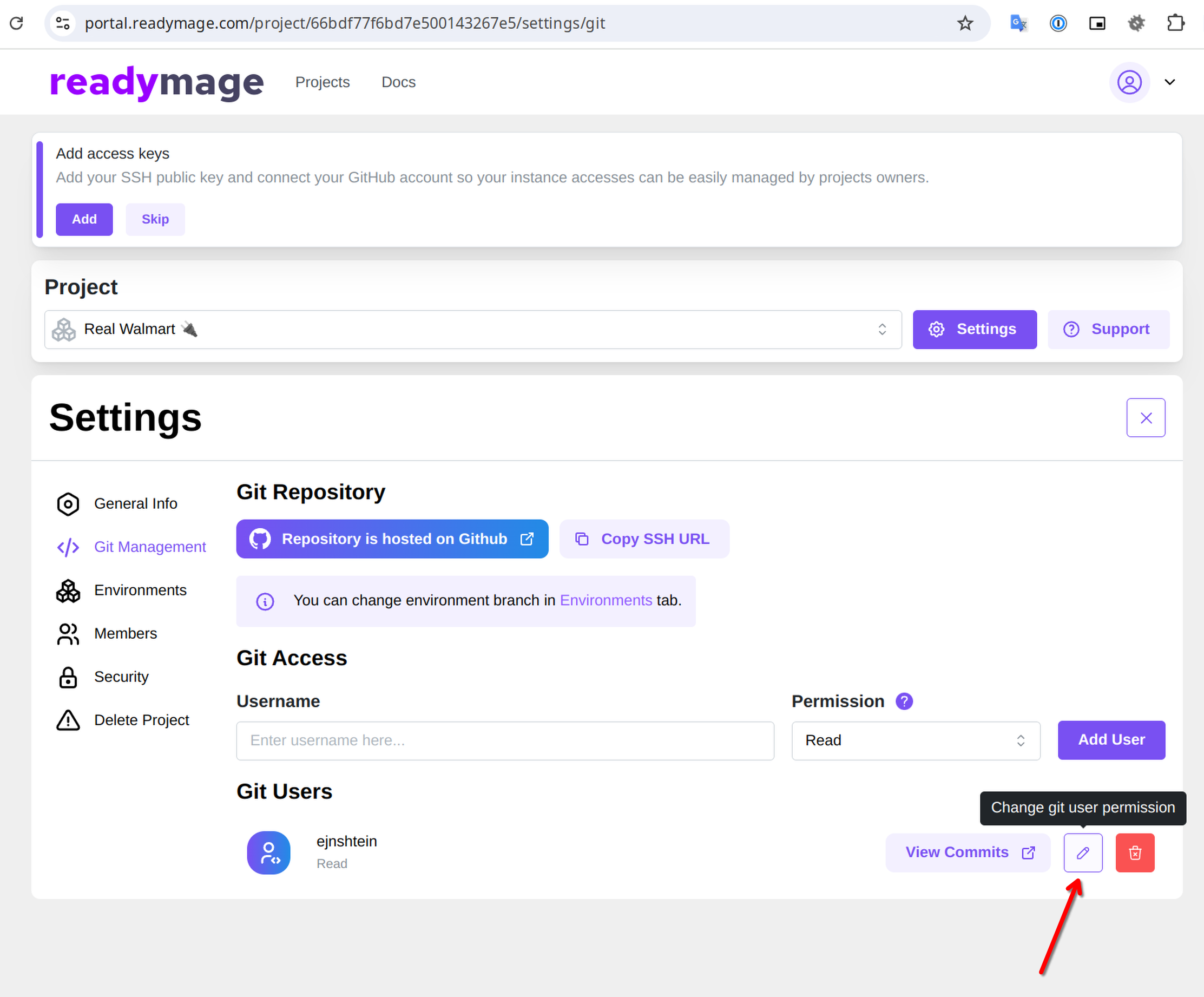 The environment source code is hosted on GitHub. Here you can grant and remove access to the repo and quickly see commits made by a specific person.