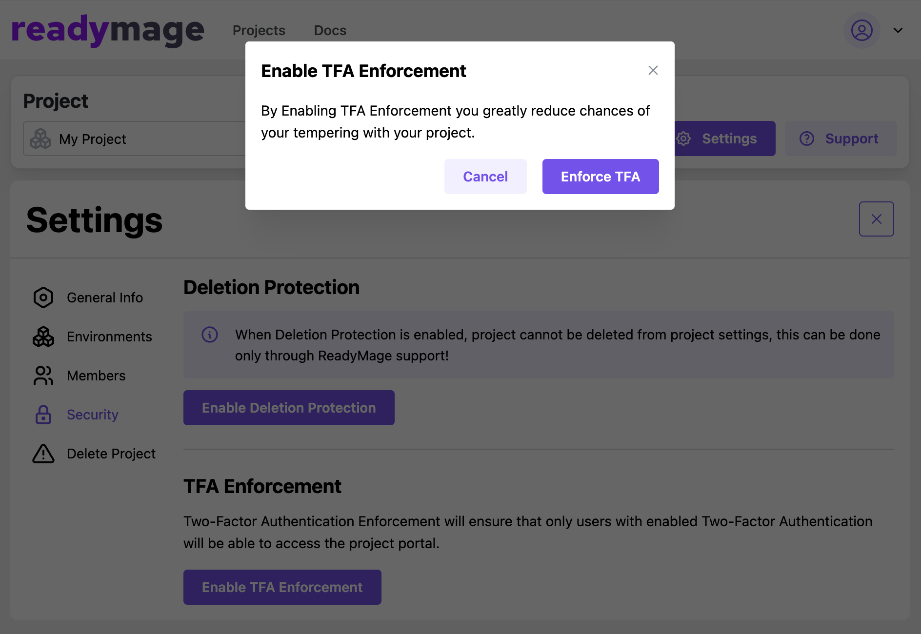 Before enabling the TFA Enforcement Owner or Admin of the project must set up Two-Factor Authentication in the account settings. Setup details can be found [here](https://help.readymage.com/user-portal/two-factor-authentication).